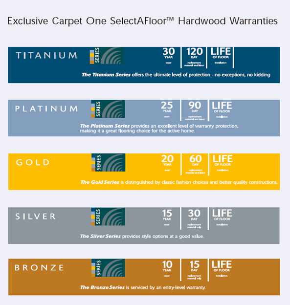 Some of our exclusive hardwoods carry a No Questions Asked Replacement Warranty.  If at any time after installation and during the term of your replacement warranty you wish to change your new hardwood for a different style or color wood floor your Carpet One retailer will replace it with different style or color of equal value from our SelectAFloor Hardwood display.  Should you wish to replace your flooring with a SelectAFloor Hardwood upgrade, you may do so by paying the difference in price.  No monetary compensation will be paid if a lower price product is selected.